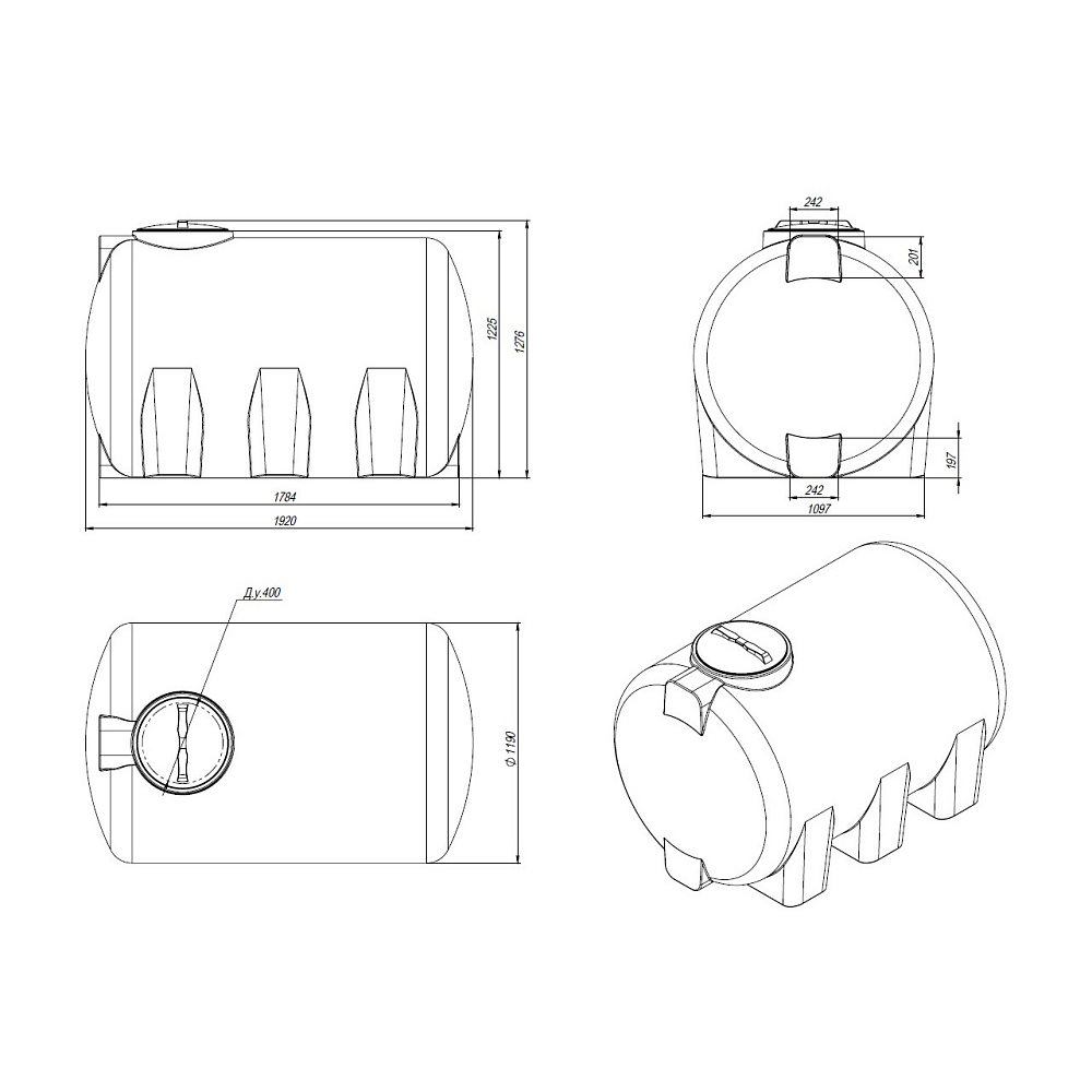 емкость, для воды / для дизельного топлива, форма емкости: цилиндрическая, тип эксплуатации: наземная, расположение: горизонтальное, тип крышки: резьбовая, плотность вещества макс.: 1,2 г/куб. см, объем 2 000 л