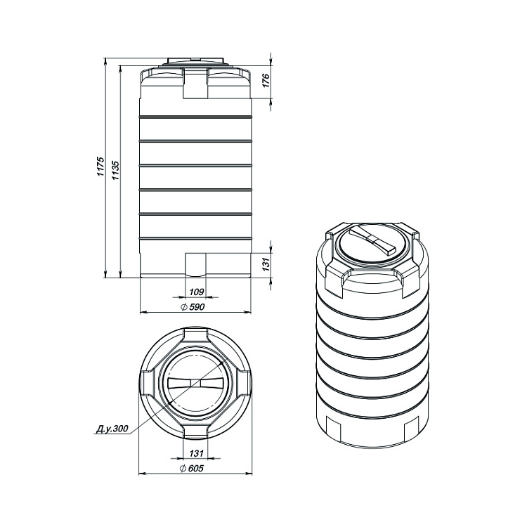 емкость, для воды / для дизельного топлива, форма емкости: цилиндрическая, тип эксплуатации: наземная, расположение: вертикальное, тип крышки: резьбовая, плотность вещества макс.: 1,2 г/куб. см, объем 300 л