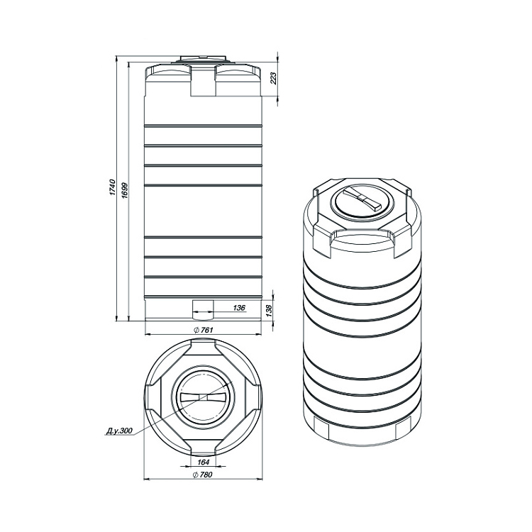 емкость, для воды / для дизельного топлива, форма емкости: цилиндрическая, тип эксплуатации: наземная, расположение: вертикальное, тип крышки: резьбовая, плотность вещества макс.: 1,2 г/куб. см, объем 750 л