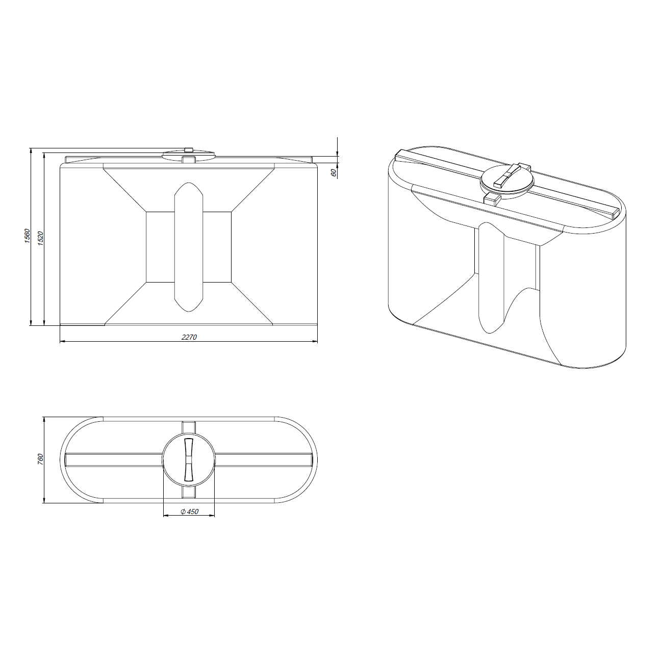 емкость, объем: 2 000 л, форма емкости: прямоугольная, тип эксплуатации: наземная, расположение: горизонтальное, диаметр горловины: 45 см, материал: полиэтилен