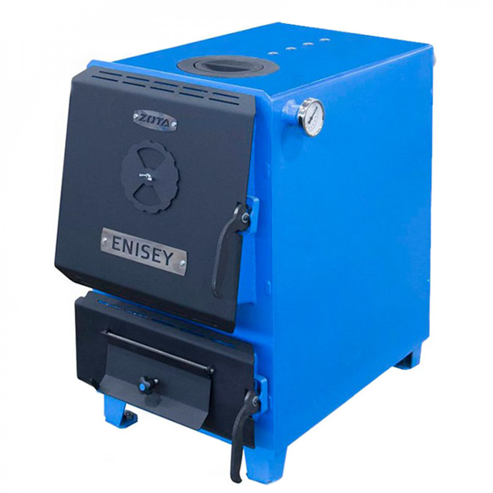 Твердотопливный напольный котел «Енисей» - современное отопительное оборудование, предназначенное для организации водяного отопления в жилых помещениях. Загрузка топлива (уголь, антрацит, дрова до 600 мм) производится через переднюю дверцу, которая открывается при помощи ручки. Верхняя чугунная плита позволяет готовить/разогревать на ней еду, а также закладывать топливо через съемные поверхности. Котел может непрерывно работать на одной загрузке топлива до 8 часов. Зольник водоохлаждаемый, зольная дверца позволяет легко и быстро убрать из котла отработанный уголь. Термометр на боковой стенке котла показывает температуру воды в системе.  Дополнительно есть возможность монтажа механического регулятора тяги и опционально – комплекта ТЭНБ 2 (электричество как вспомогательное топливо).