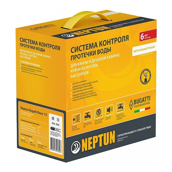 система, модуль управления: Neptun base, питание 220/50 В/Гц, способ передачи сигнала: проводной, максимальное кол-во датчиков: до 20 проводных датчиков серии SW, кран: Neptun Bugatti Pro 220В. 2шт., функция автоматического проворота кранов: есть, макс. кол-во подключаемых шаровых кранов: 6