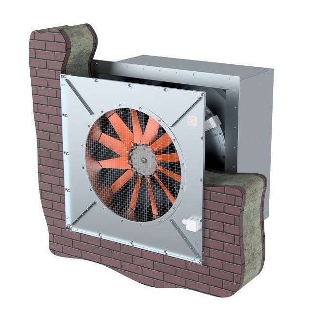 осевой вентилятор, максимальный расход воздуха 34 000 куб. м/ч, максимальный располагаемый напор 1 080 Па, взрывозащищенный, присоединительный размер 630 мм, материал корпуса: сталь, монтаж: настенный, степень защиты: IP54