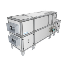 Особенности и преимущества: встроенная цифровая автоматика (MODBUS), пульт управления с цветным сенсорным дисплеем, удаленное управление (WEB-интерфейс), управление вентилятором по датчикам CO2 / VOC (опция), контроль загрязненности воздушного фильтра (цифровой датчик давления), управление увлажнителем, управление вытяжным вентилятором, воздушное отопление (опция CT), недельный таймер, VAV-совместимая вентустановка, вентилятор EBMPapst серии EC (инверторный), 10-ти ступенчатое регулирование производительности, фильтр класса G4 на входе притока, управление внешним ККБ, воздушный клапан на входе притока, с электроприводом с возвратной пружиной, термо- и шумоизолированный корпус, пластинчатый рекуператор.