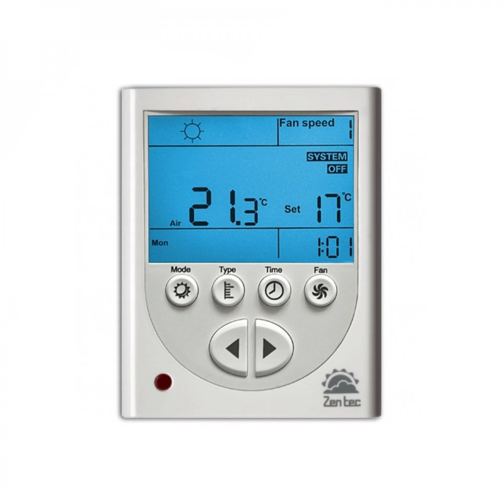 приточная вентиляционная установка, автоматика ZenTec, электрический тип нагревателя, площадь 90 м2, настенный способ установки, воздухообмен 270 м3/ч, фильтр тонкой очистки Е11, пульт ДУ, класс защиты IP54