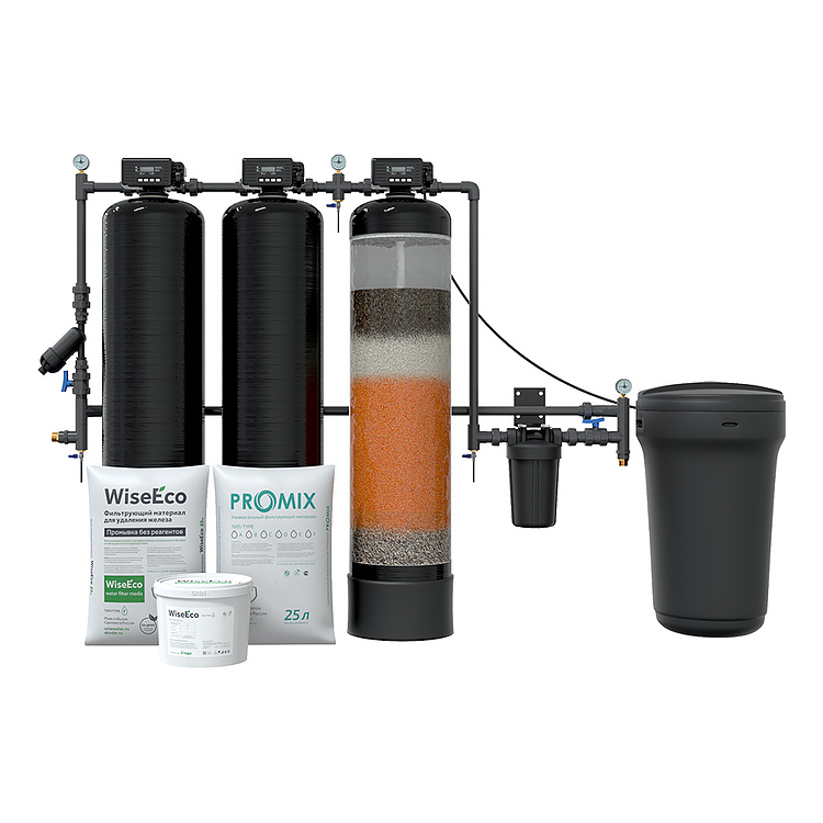 Особенности и преимущества: поршневой механизм распределения потоков воды; аэрационная колонна: позволяет без применения компрессора интенсивно насыщать воду кислородом воздуха и интенсифицировать процессы окисления растворённого железа, регенерация установки (заполнение кислородом) производится в автоматическом режиме с помощью электронного управляющего клапана по сигналу с внешнего устройства; фильтр-обезжелезиватель: удаляет растворённое и нерастворённое в воде железо, марганец, органические примеси, снижает мутность воды, регенерация фильтра не требует использования реагентных материалов и производится в автоматическом режиме с помощью электронного управляющего клапана; универсальный фильтр с комплексной загрузкой ProMix: снижает содержание в воде ионов кальция и магния до рекомендуемого уровня 1,5-2,5 мг-экв/л, удаляет железо, марганец, аммоний и органические соединения природного происхождения, умягчает воду до комфортных значений, регенерация фильтра производится в автоматическом режиме с помощью электронного управляющего клапана по сигналу таймера или встроенного счётчика, грязевик - предназначен для защиты автоматики водоочистного оборудования от крупнодисперсных взвешенных частиц (песок, трубная окалина и т.п.), разбивка на несколько стадий регенерации, возможность как прямоточной, так и противоточной регенерации, возможность сухого хранения соли, низкий расход воды на регенерацию.