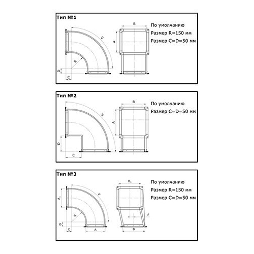 Отвод прямоугольный ГиперВент 1500х1500-90° шейка 50х50 (Ф30-Ф30) R-150